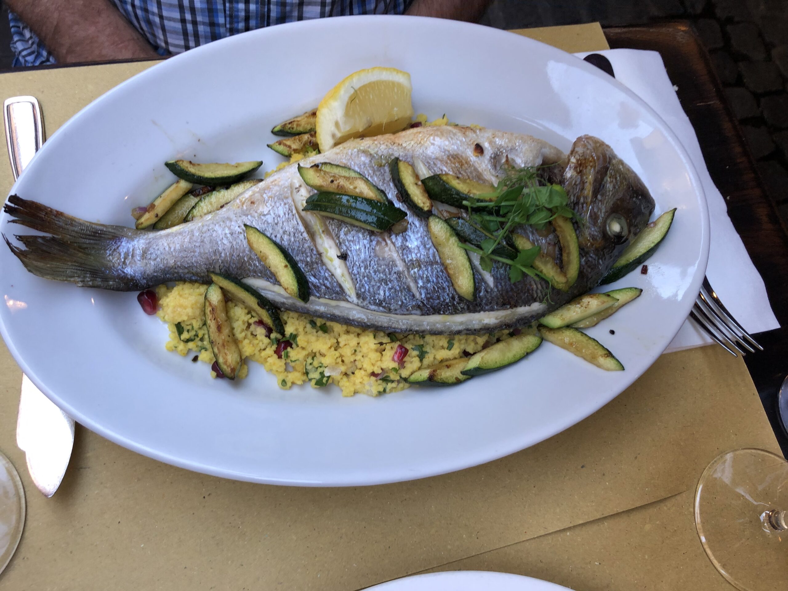 GRATINIERTE ZWIEBELSUPPE I CROÛTONSHUMMERBISQUEIm Ofen gebackene ganze Dorade Royal mit sautierten Zucchini, dazu Couscous-Salat mit GranatapfelkernenKALBS- CORDONBLEU MIT POMMES ALLUMETTES ODER SALATCarmelo Rodero 2020 Bodegas Rodero, Ribera del DueroENTRECÔTE CAFÉ DE PARIS 200g I GRATINIERT I POMMES ALLUMETTESDessert Mousse au chocolat